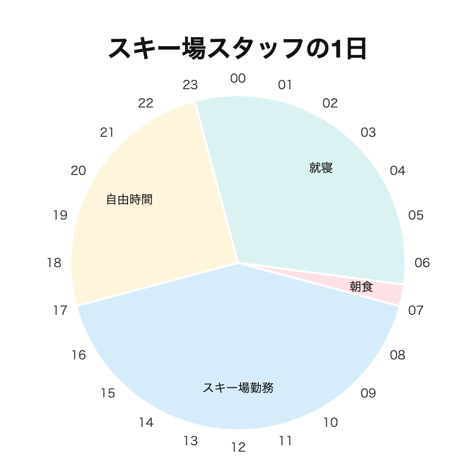 主に夜の夕食提供がメインの業務になります。旅館の場合は朝食やベッドメイクの時間も業務時間になります。お客さんはスキーに来ているため、昼間〜夕方は基本的に毎日滑ることができます。